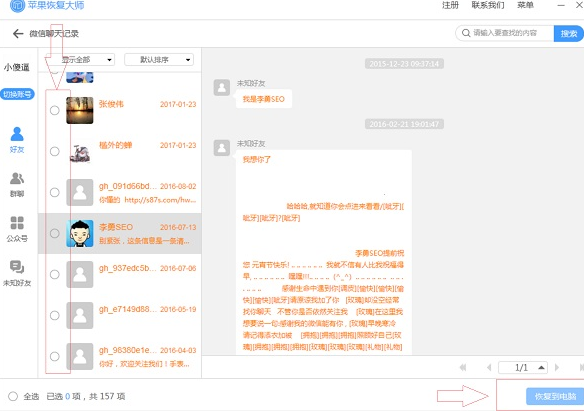 6、进入微信聊天记录界面。可以看到界面上有两种颜色的字体,橙色的表示是已删除的微信聊天记录,而黑色的是未删除的微信聊天记录,点击“恢复到电脑”,然后我们就可以在电脑以网页或者网格的形式查看恢复过来的微信聊天记录。