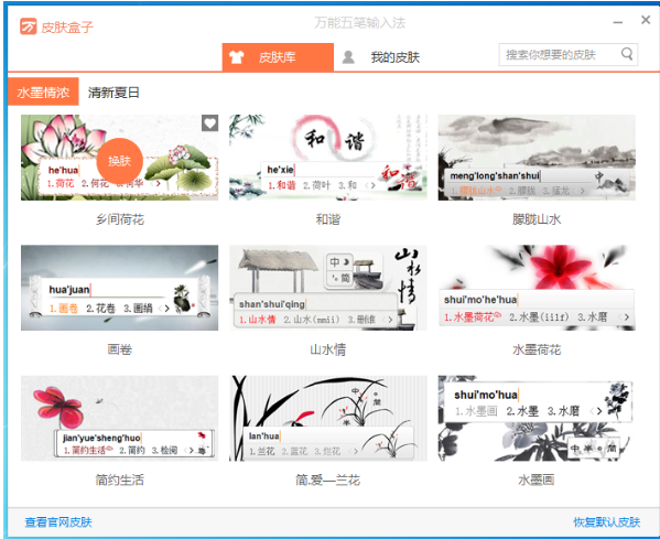 2、点击后会弹出万能五笔输入法的皮肤盒子,在这里可以看到一些自带的皮肤,想要使用哪个就点击哪个即可;