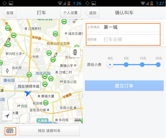 3、在打车页面中,点击底部的键盘,可以通过文字输入你的打车地点、目的地、以及进行订单提交。