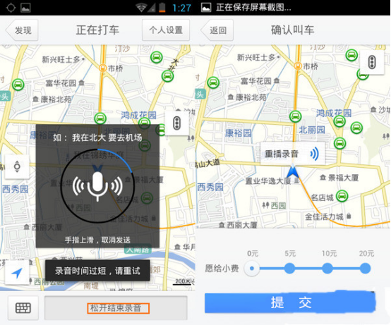 4、文字输入比较麻烦,可以点击底部的“录音”进行语音叫车,说出你所在的地点并进行提交订单,不久后就会有司机跟你联系了。