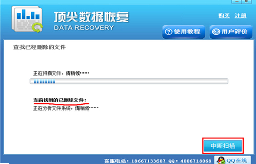 3、进入硬盘扫描阶段,如果用户发现丢失的数据已经被扫描到,也可以“中断扫描”。