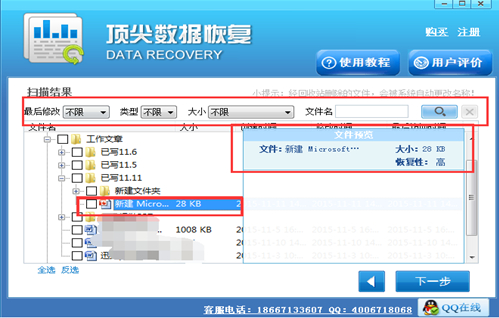 4、选择需要恢复的文件,用户可以使用最后修改、文件类型和文件大小来赛选需要恢复的数据,如果知道文件名就更容易找到需要的PPT了。