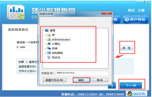 5、选择恢复文件存放目录。用户可以将文件恢复到U盘上,以防止造成数据覆盖问题,然后点击下一步,等待恢复完成。