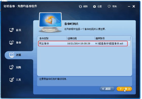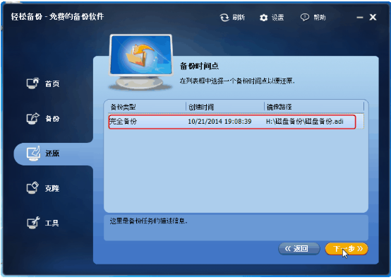 途径2:点击“还原”选项,然后所有的备份任务将陈列出来。选择你想还原的那个,然后点击“下一步”(如果镜像文件没有显示在陈列栏里,如备份到光盘或网络路径,你可以通过点击“路径”按钮来选择备份镜像文件)。