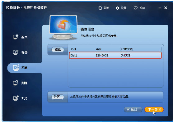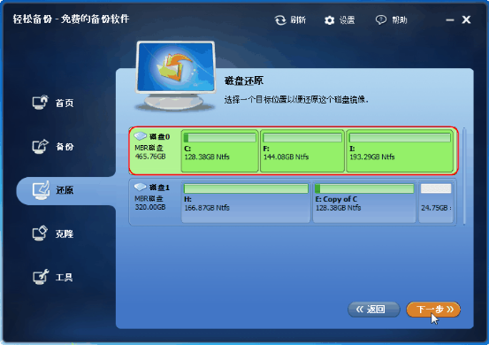 第一步、打开轻松备份软件,你可通过两种途径选择一个你想还原的磁盘。