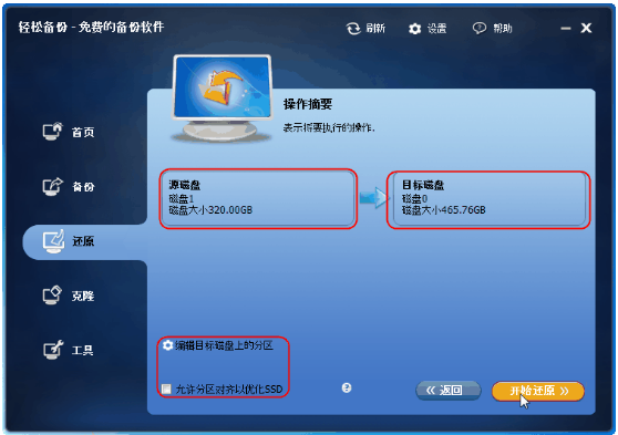第四步、在此步骤中,源磁盘和目的地磁盘将被陈列出来。你需要确认将执行的操作,然后点击“开始还原”。