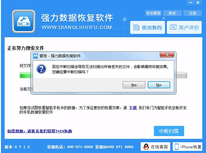 3、软件进入扫描状态,请用户耐心等待,在扫描期间如果发现软件已经将要恢复的数据扫描完成,也可以选择“中断扫描”。