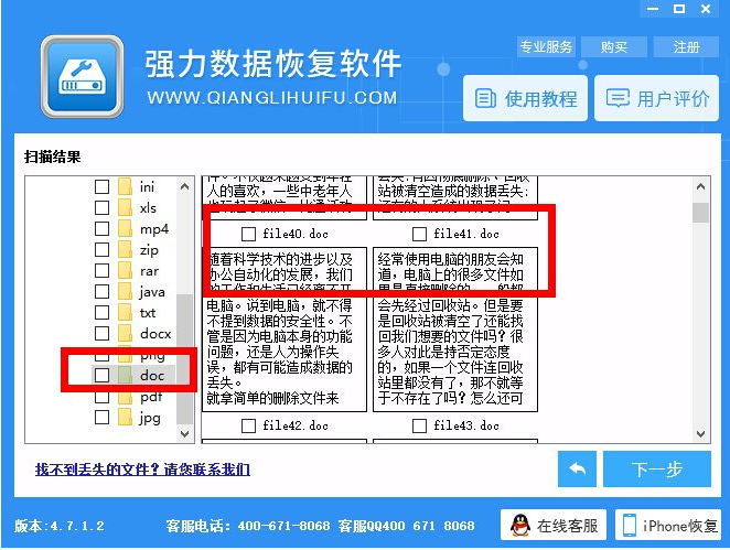 4、接着,在强力数据恢复软件界面中,勾选要恢复的手机通讯录,点击“下一步”设置文件储存路径。