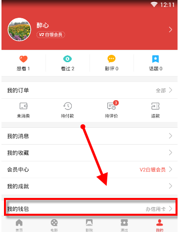 1、打开猫眼进入应用后点击下方【我的】,接着点击【我的钱包】,如下图;