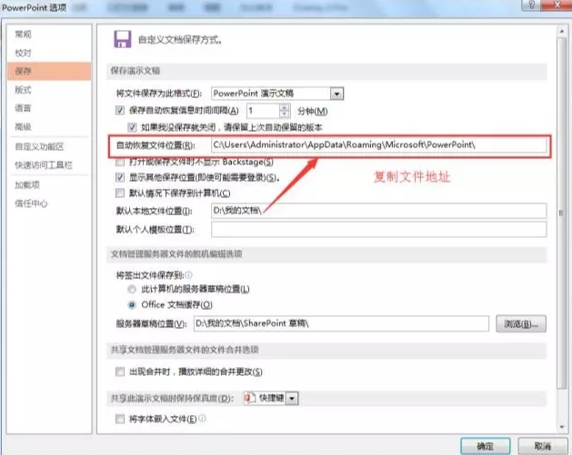 2、点击左面的菜单栏中的“保存”,并在右方“保存演示文稿”下的“自动回复文档位置”中复制恢复文档的地址,以你自己的位置为准。复制之后点击“确定”将它关闭;