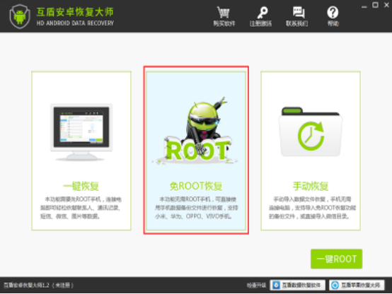 2、在电脑上打开互盾安卓恢复大师,开启手机USB调试模式,并将手机连接到电脑上,然后点击软件界面上的“免ROOT恢复”按钮。