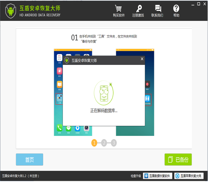 5、成功在手机上进行备份后,点击右下方的“已备份”按钮。软件会开始解析数据库数据。