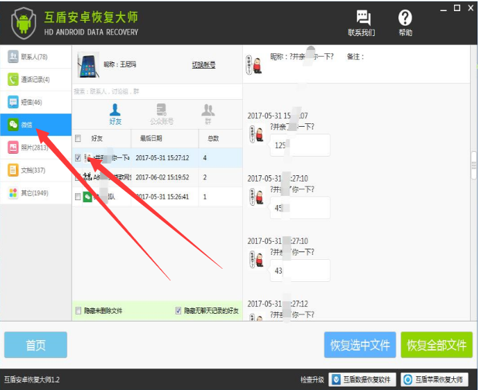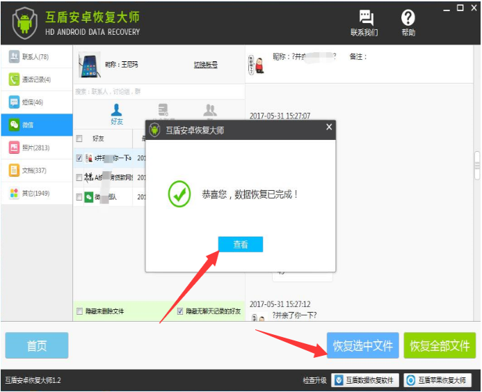 7、最后点击“恢复选中文件”按钮,就可以点击“查看”按钮来查看我们已经通过免ROOT恢复的微信聊天记录了。