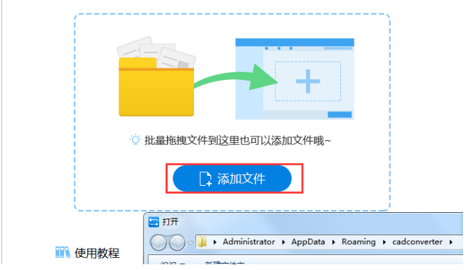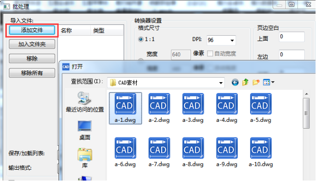 2、然后在弹出的批处理操作窗口中,点击“添加文件”按钮,然后在弹出的窗口按照路径找到需要转换的CAD文件;可以一次选中多个CAD文件,进行批量转换。