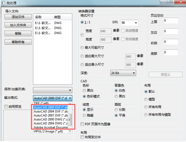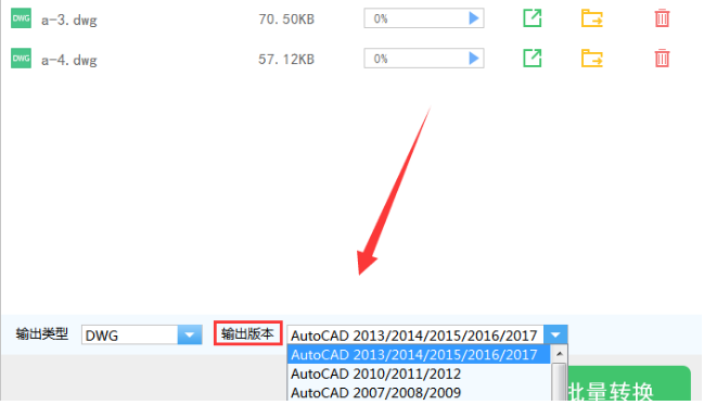 3、CAD文件添加完成后,我们可以在底部的输出版本列表中选择需要转换的CAD文件版本。