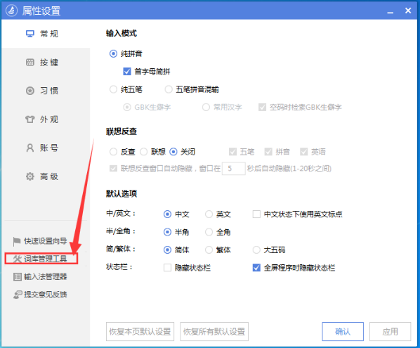 3、打开“设置属性”窗口后,我们在该窗口的左侧打开“词库管理工具”;