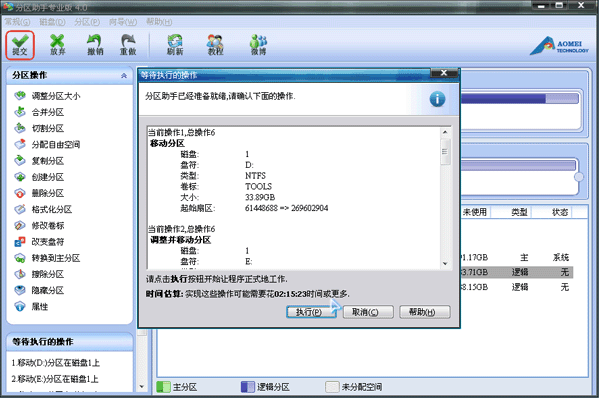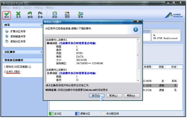 4、提交以上操作,点击工具栏的“提交”按钮,在弹出的窗口点击“执行”,如图4。 执行过程中可能需要花一会时间,所花时间的长短由分区中的数据的多少而定。这需要您耐心地等待,请不要强行终止程序: