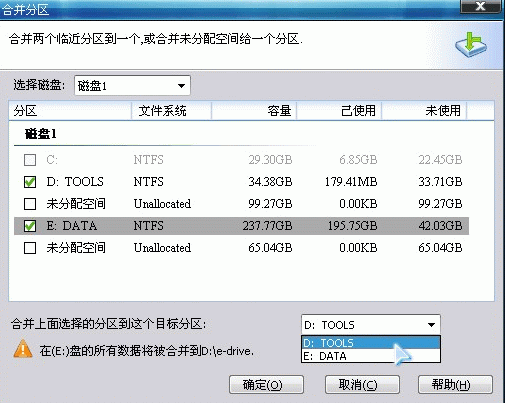 1、如图5,将D和E合并,前面的操作步骤都是一样的。D和E盘合并到D盘(注意:合并之后在D盘之下会建立一个 e-drive的文件夹,E盘的数据都会被移动到这里),勾选D、E,在右下角选择合并到D