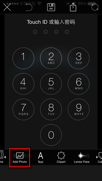2、在PicsArt的图片编辑框内添加这个iPhone数字解锁界面的图片。