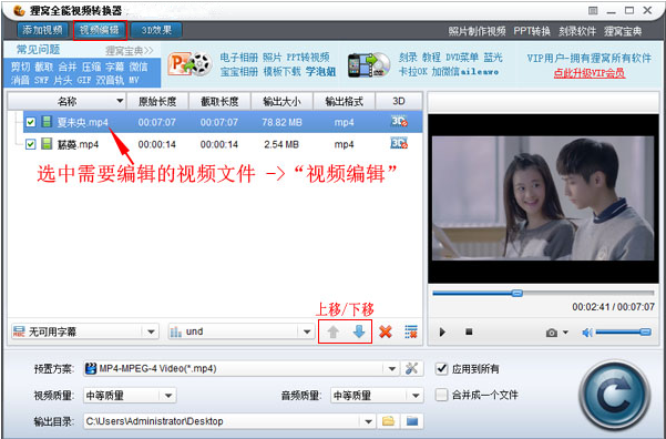 这里演示的是将视频尾部剪掉,再加上另一个视频,所以导入两个视频文件。如下图所示,在文件列表区中,需要剪辑的视频放在第一位(顶部),更换的视频文件放在第二位(底部),排位顺序不对,可通过“上移”或“下移”按钮进行调整。
