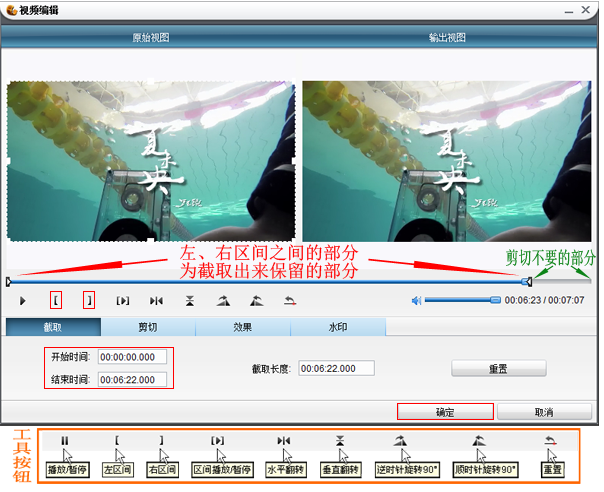 图中所示的时间轴上,左、右区间之间的部分为截取出来保留的部分,右边(即尾部)未选中的部分就是去掉不要的部分了,然后点击“确定”保存设置并返回主界面。
