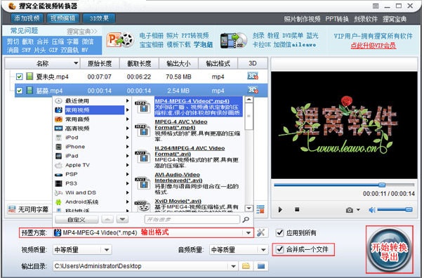 再在“预置方案”中选择需要输出的视频格式,还有设置“输出目录”,然后单击右下角的圆形按钮,开始转换导出合并的视频文件。
