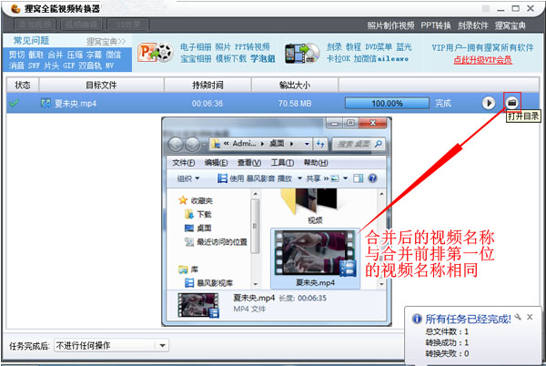 5、随后跳转到转换进程界面,相对转换较快,很多久就能转换完成了。如下图,单击“打开目录”即能看到成功导出的编辑后的视频文件了。文件名称与排序第一位的视频文件名称相同。