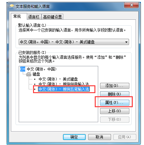 2、在“设置”界面我们选中搜狗五笔输入,然后点击“属性”;