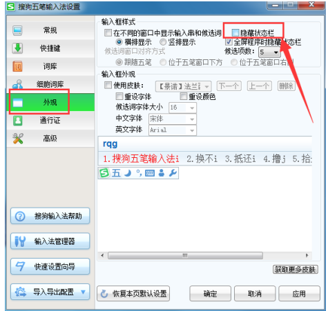 3、之后在搜狗五笔输入法“设置属性”的窗口中打开“外观”界面,在这里将“隐藏状态栏”取消勾选就可以了;