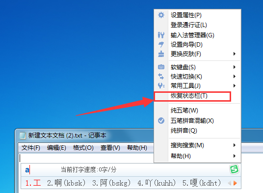 2、随便输入几个字母,记得不要打出来,之后在选字框中点击鼠标右键,并在弹出的选项中点击“恢复状态栏”就可以了。如下图所示: