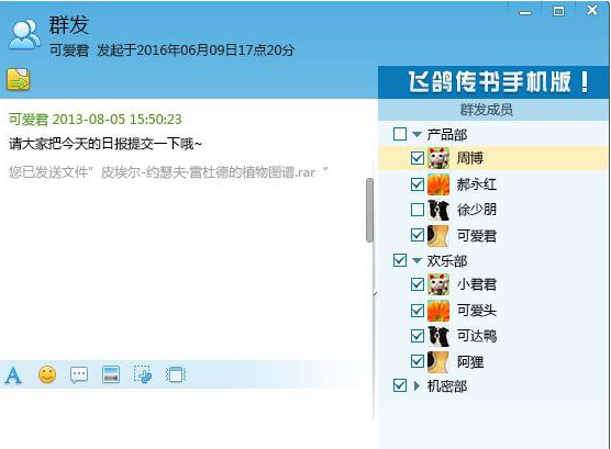 2、群发功能还是基于全员的消息通知,默认选择全部在线用户,将消息和文件以个人的形式发送出去,对方如果对群发消息进行回复,会单独收到回复消息。