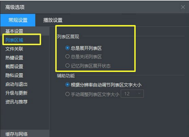 3、在高级选项界面点击【常规设置】-》【列表区域】,在右边的三个选项内勾选自己想要的操作点击确定即可。