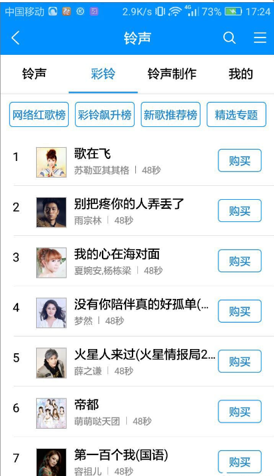 2、滑到彩铃页面,选择自己想要的手机彩铃,点击铃声后面的“购买”,如下图。
