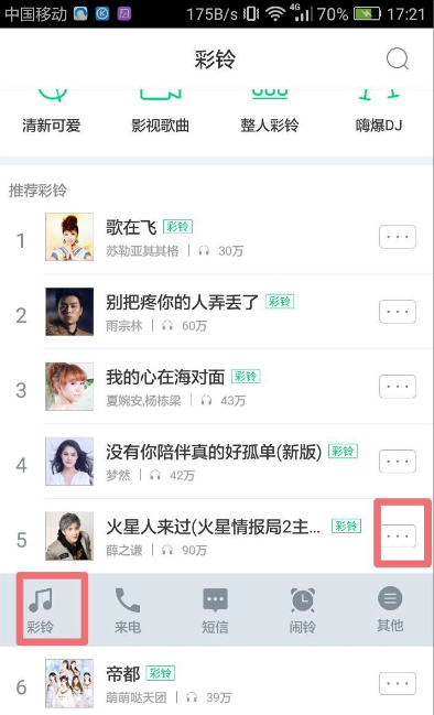 6、选择自己想要的手机彩铃,点击彩铃右边的点点符号,选择“彩铃”,如下图。