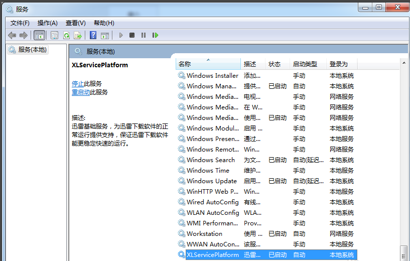 2、在服务窗口中找到XLServicePlatform服务并双击,就可以看到它的状态是自动并且已经启动了。