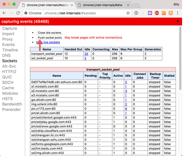 5、点击「Flush pocket pools」按钮以清除 Chrome 的 socket 池。