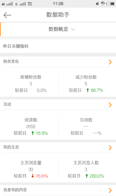 4、点击数据概览:在数据概览这里可以看到昨天的微博总的一个变化情况,比如粉丝变化、互动情况、我的主页浏览量、浏览人数、我发布的内容等等。