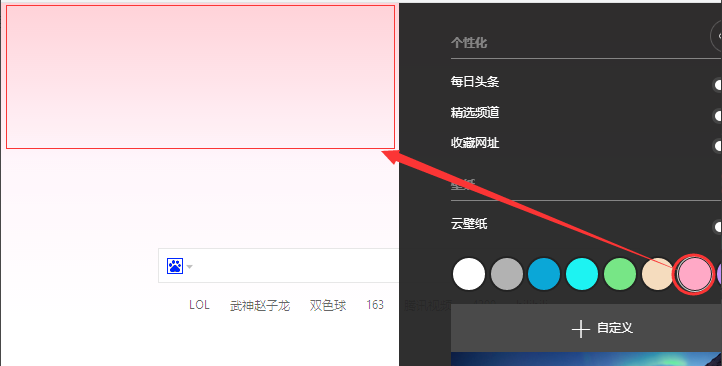 3、之后会弹出个性化设置对话框,可以设置颜色、背景图片,还有每日头条、精选频道和收藏网址等;