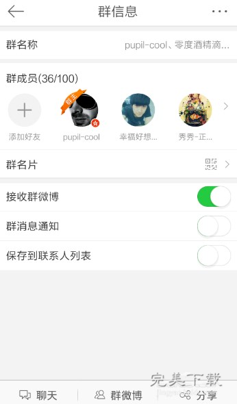 5、点击打开一个群后,我们可以选择开始聊天或者发送群微博了。