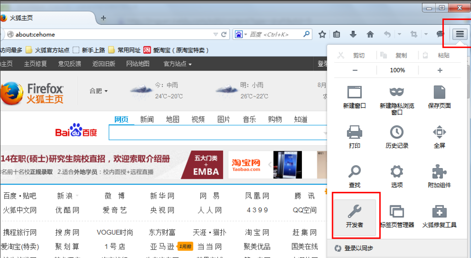 火狐浏览器打开的方式和谷歌浏览器差不多。先点击右上角的菜单,选择“开发者”。