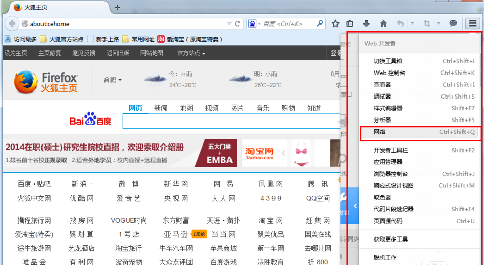 火狐的工具比较丰富,这里我们选择“网络”。