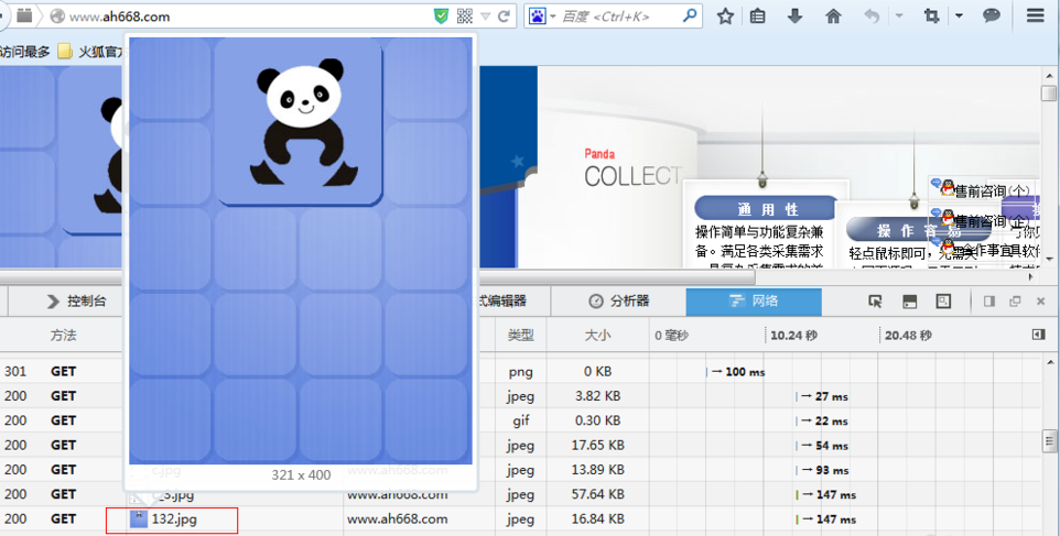 之后的使用方式都大同小异,火狐抓包工具界面是中文的,而且有预览图片的功能,把鼠标放在抓取的图片请求上面就会显示出该图片来,是一款非常优秀的抓包工具。