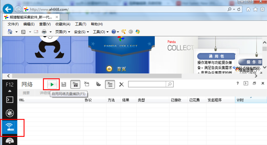 同样选择网络,IE抓包工具默认是关闭状态,点击开始网络流量捕获就可以监控了。