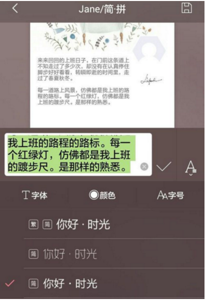 5、点击文字部分,可以对文字内容、字体、颜色和字号进行修改,