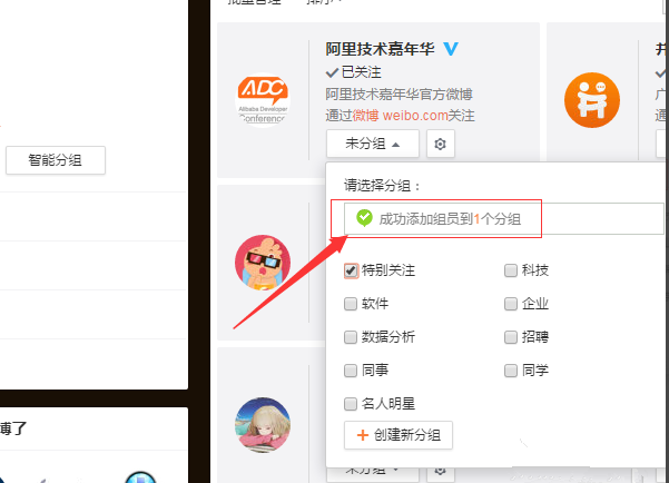 3、勾选特别请关注之后,会提示“成功添加组员到1个分组”中说明已添加成功了。
