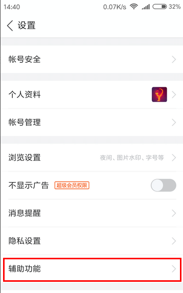 5、返回上一页,重新回到设置页面,点击进入“辅助功能”。