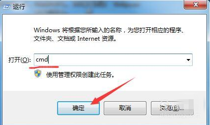 2、在我们打开的“运行”窗口中输入命令“cmd”点击确定。