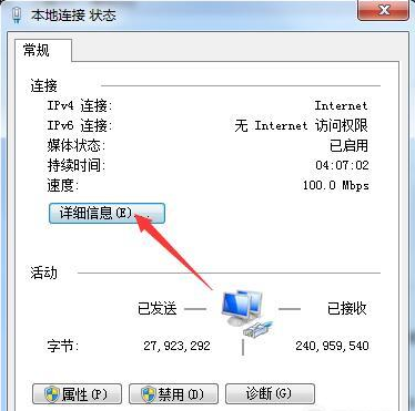 3、我们点击“本地连接”,就会弹出“本地连接状态”窗口,会看到有一个“详细信息”,点击它,
