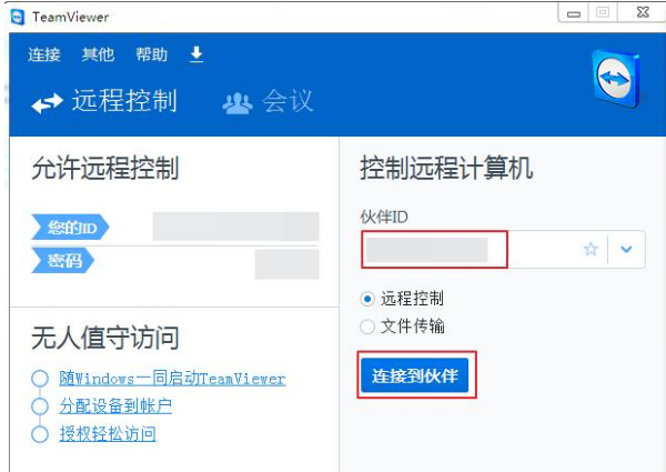 3、在TeamViewer软件界面右侧“伙伴ID”栏输入对方电脑上TeamViewer界面上的ID号,然后点击“连接到伙伴”。
