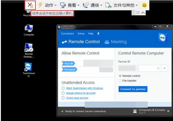 9、最后结束远程控制:在界面上方的工具条左端,有一个×的图标,点击该按钮则“结束会话并锁定远程计算机”。